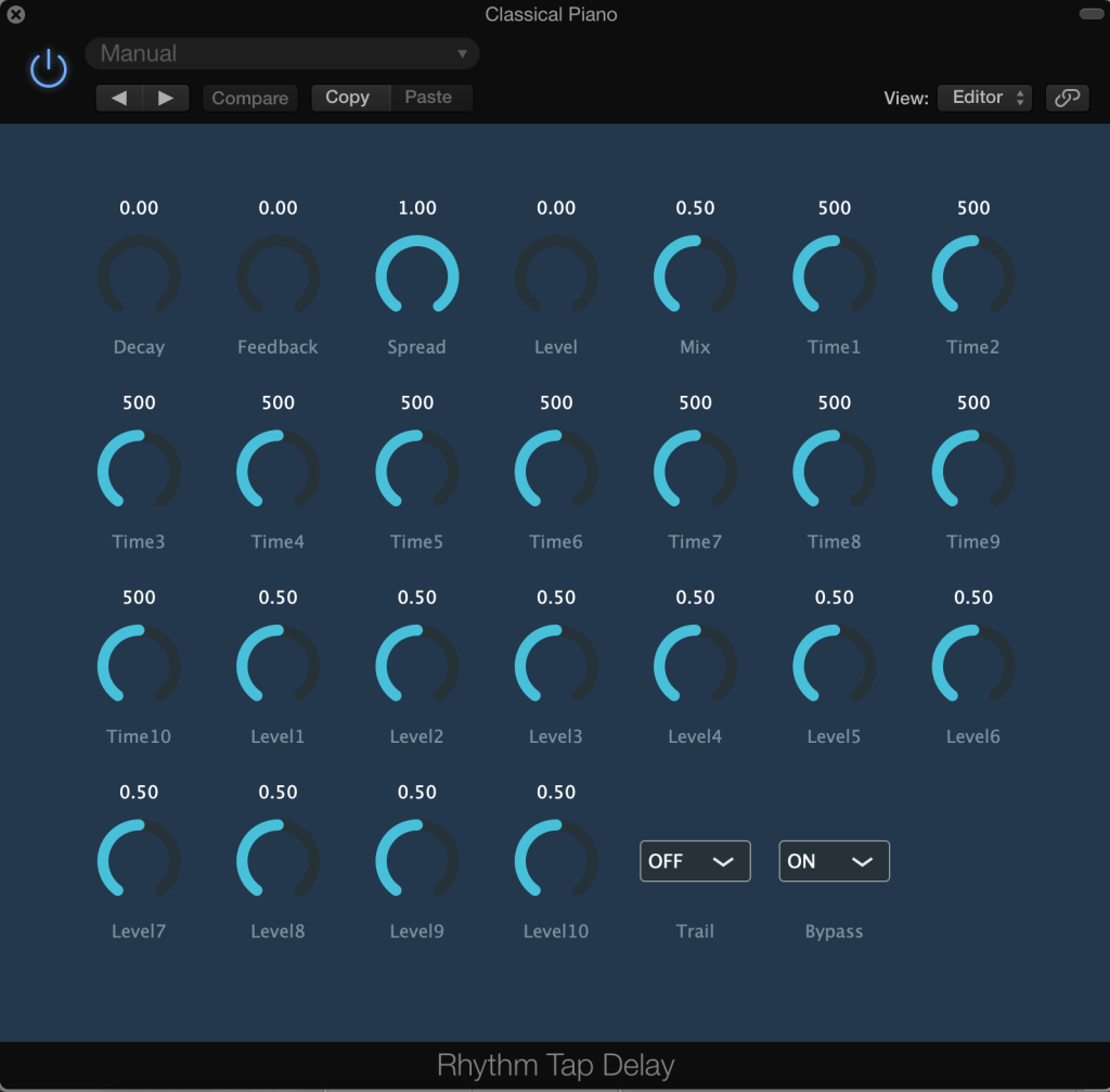 The difference between the two plugins: In the Ten Tap delay, the Tap knob controls the delay times(1-10). In the Rhythm Tap delay, the user only can justify the Level knob to control the delay times.