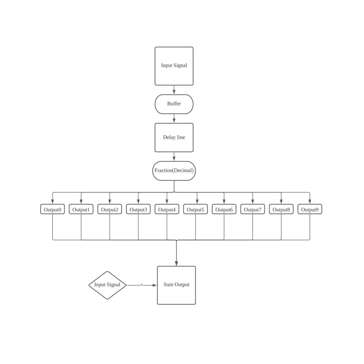 The workflow of this plugin as shown below 1.To create a Buffer for storage the input signal; 2:To create a delay line 3. Due to user use different knob in the Plugin we need to use fraction(Decimal) in the algorithm 4. The delay effects have ten taps so the output should have ten times. In the end, we need to add the input in the Sum Output.